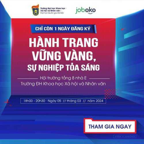 Trường Đại học Khoa học Xã hội và Nhân văn hợp tác cùng Nền tảng công nghệ tuyển dụng JobOKO tổ chức chương trình "Hành trang vững vàng, sự nghiệp tỏa sáng" với mục đích trang bị kỹ năng phỏng vấn và hòa nhập văn hóa công sở cho các bạn sinh viên. Sự kiện có sự tham gia của chuyên gia đào tạo nằm trong Mạng lưới thành viên cố vấn nghề nghiệp JobOKO, giám đốc nhân sự, quản lý đến từ các doanh nghiệp hàng đầu.